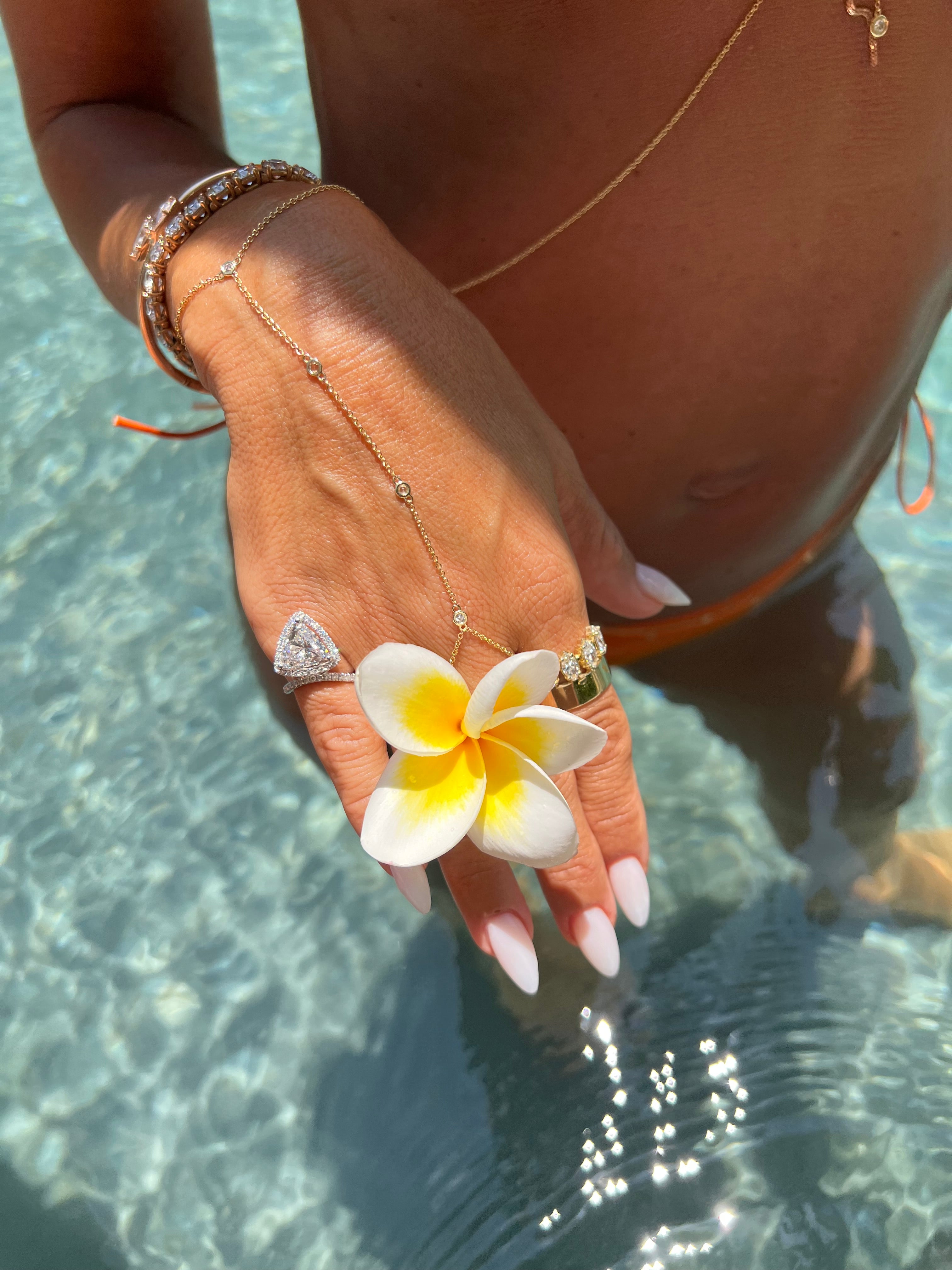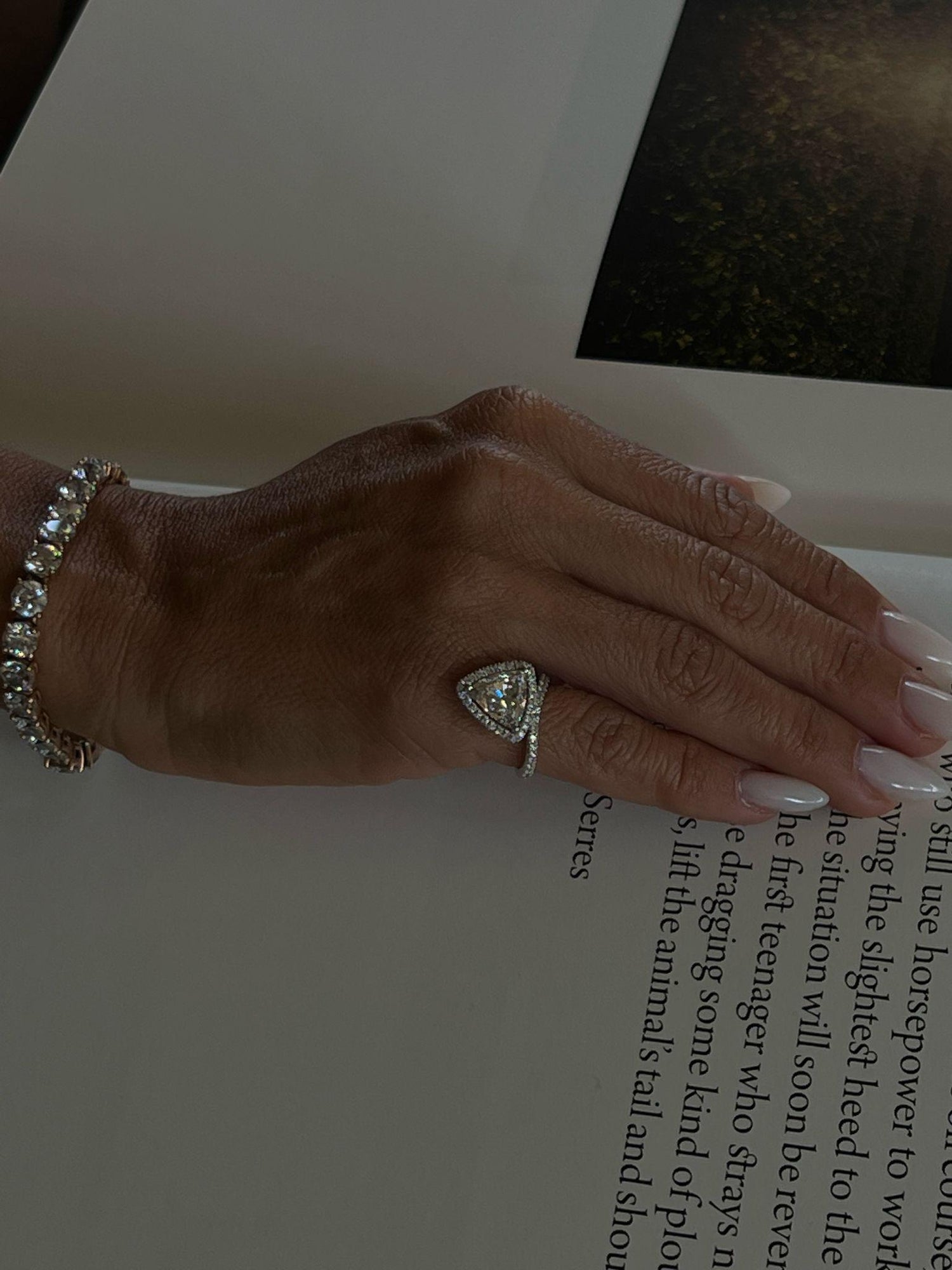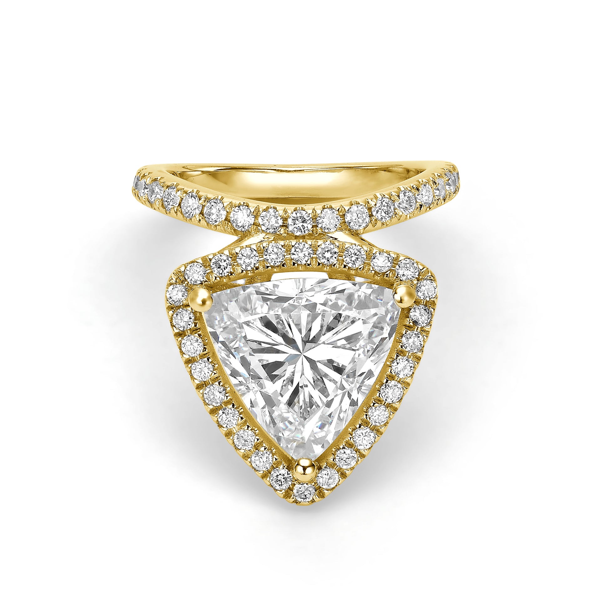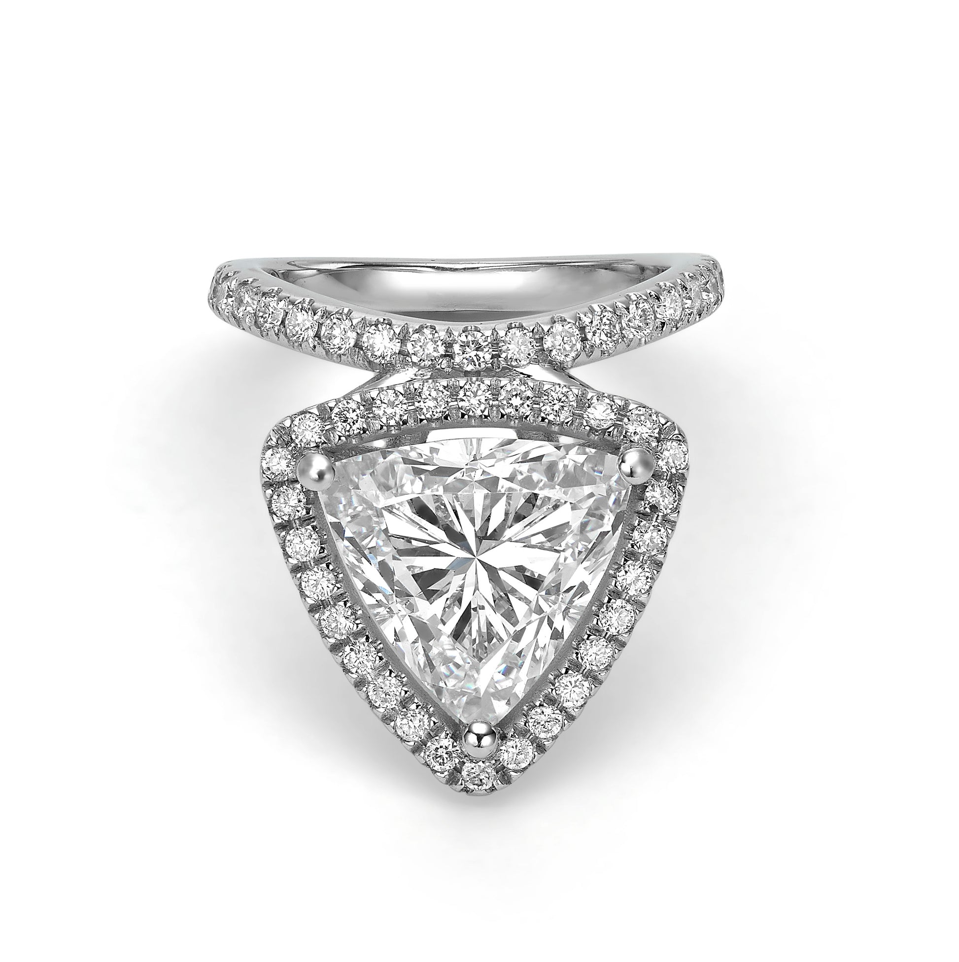 A breathtaking trillion-cut diamond is the focal point of this stunning ring, framed by a delicate halo and a double pavé band. It’s a piece that reaches for the pinnacle of style and sophistication.