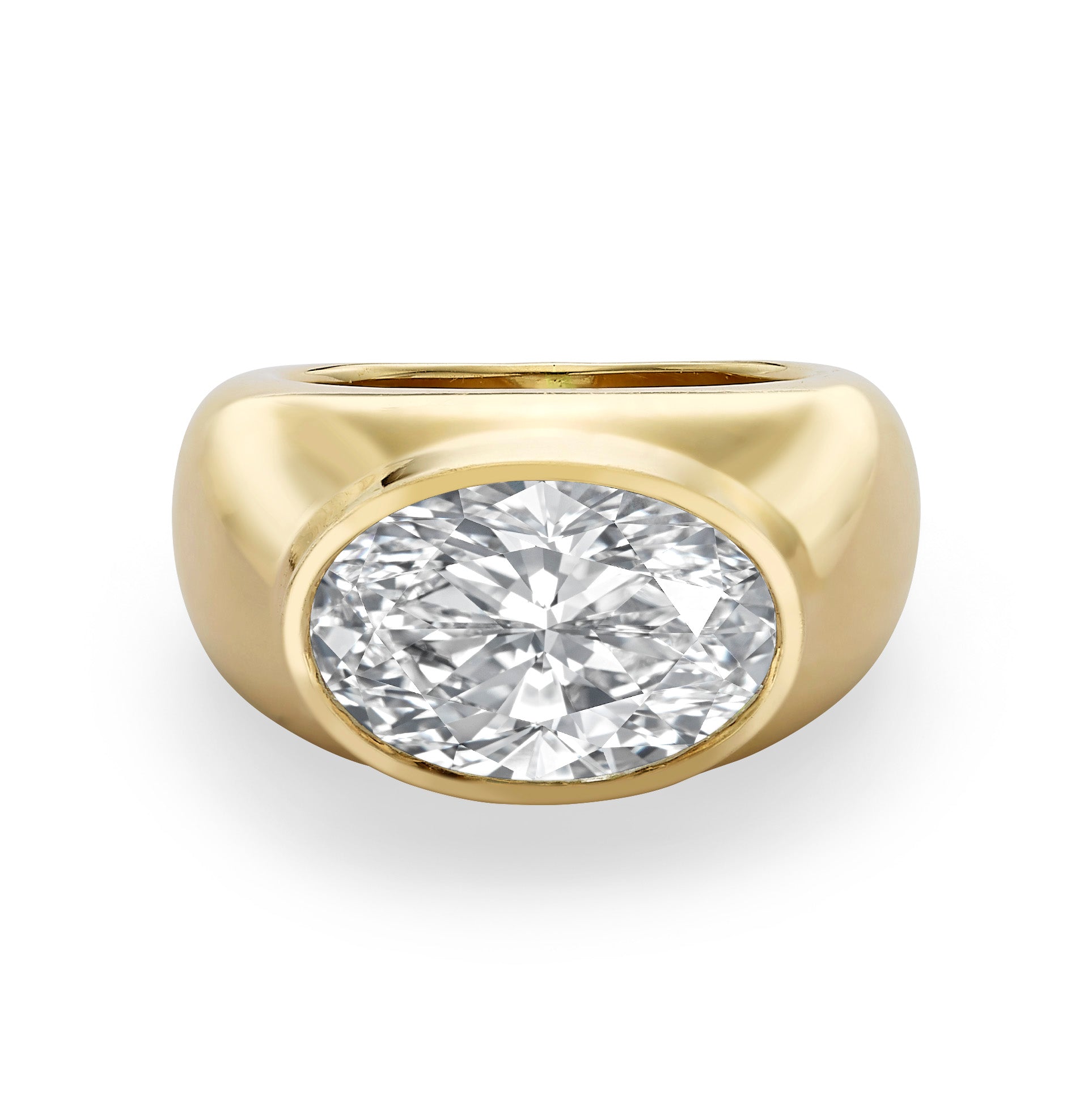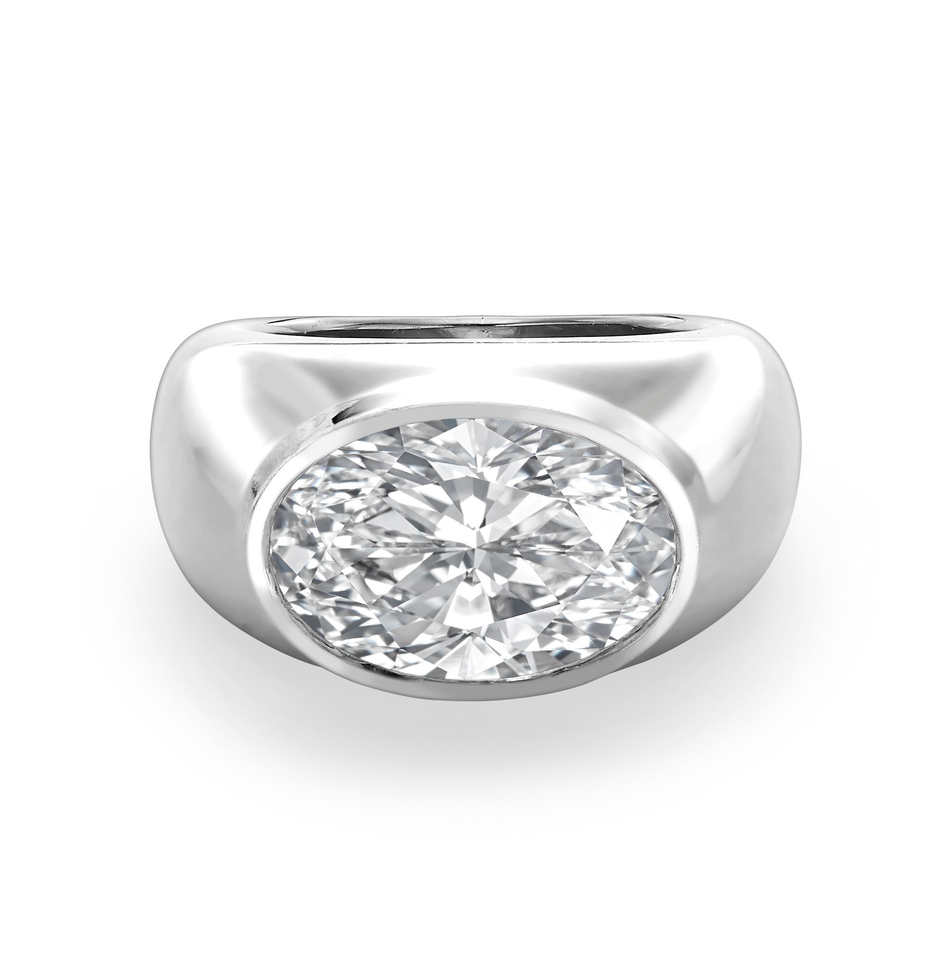 An elegant statement ring crafted in rose gold, featuring a show-stopping oval-cut lab diamond set in a bezel setting within a substantial dome band. The east-west orientation of the stone creates modern sophistication, while the wide, smooth band offers comfort and presence. A captivating piece that combines contemporary design with classic luxury, perfect for those who appreciate bold, wearable art.