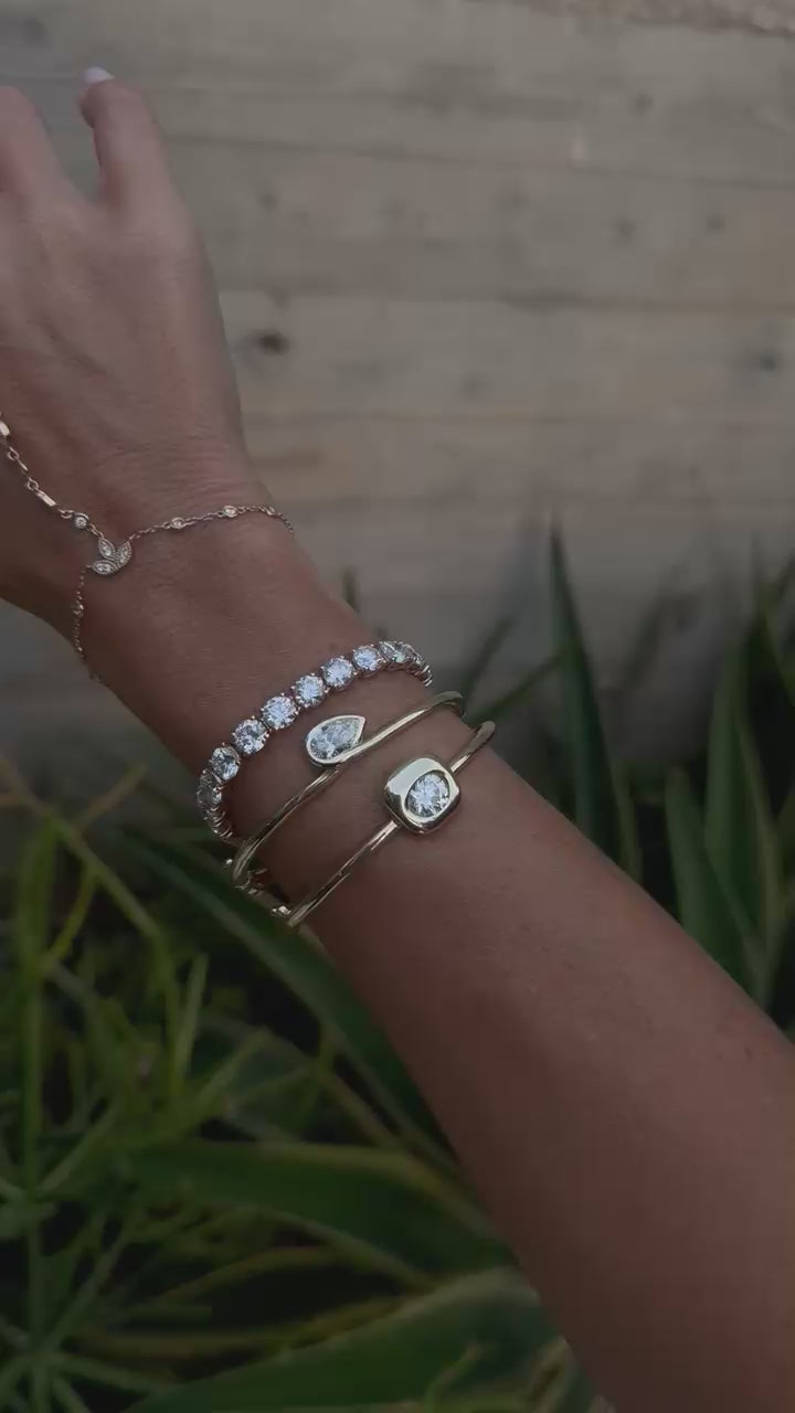 An icon of elegant simplicity, this bangle features a single, breathtaking oval diamond at its center. Set in a sleek bezel, the design focuses entirely on the stone's timeless beauty, creating a modern and minimalist piece that you'll wear every day.
