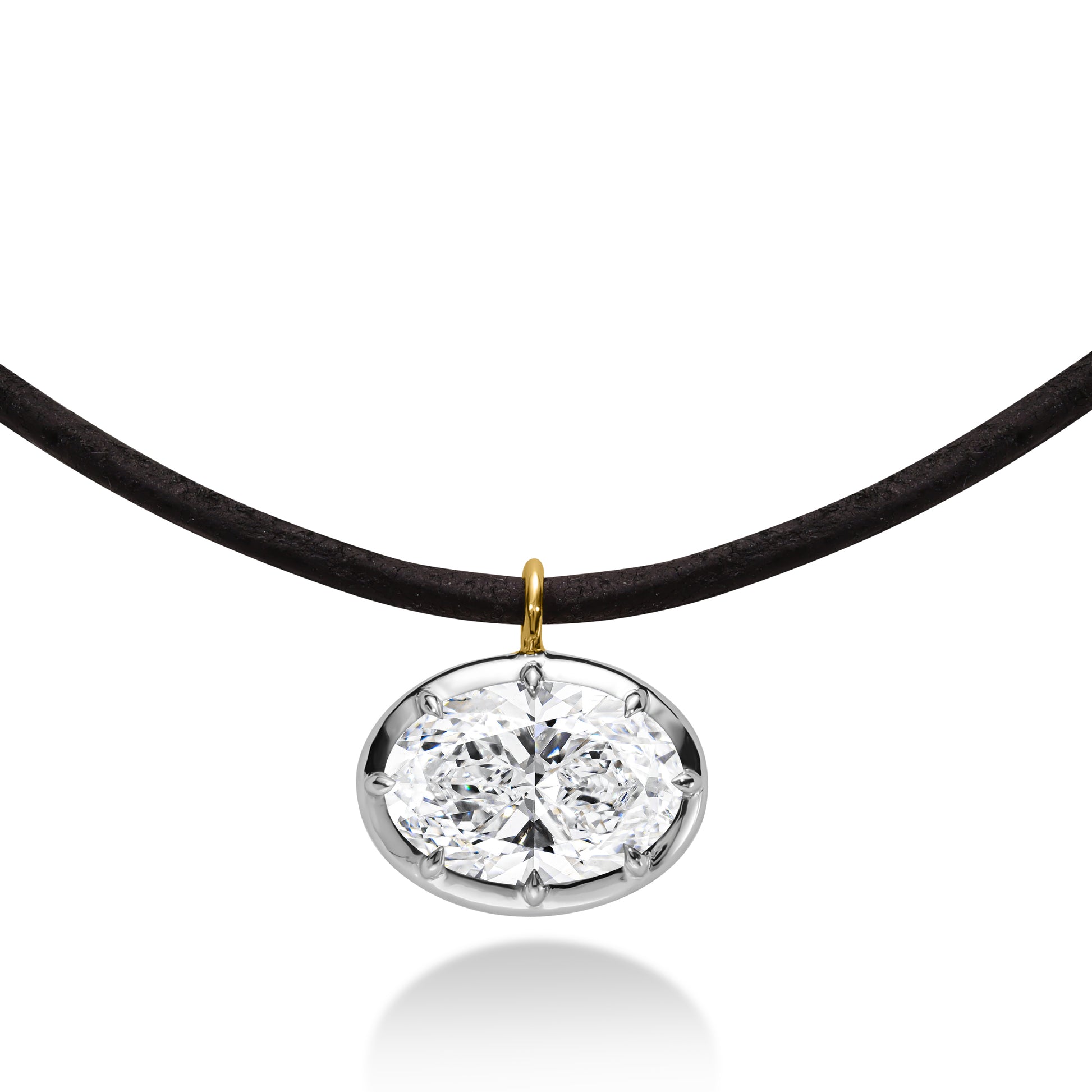 This striking contemporary necklace features a stunning 5.02-carat oval diamond set in a sleek bezel setting crafted in 14k gold. The minimalist design showcases the diamond’s exceptional brilliance against a casual yet sophisticated black leather cord, creating an unexpected pairing that’s both modern and timeless. The secure bezel setting protects the stone while allowing maximum light exposure for incredible sparkle. The leather cord offers comfortable everyday wear and an adjustable length, making this piece perfect for layering or wearing solo. This design effortlessly bridges the gap between fine jewelry and everyday style.
