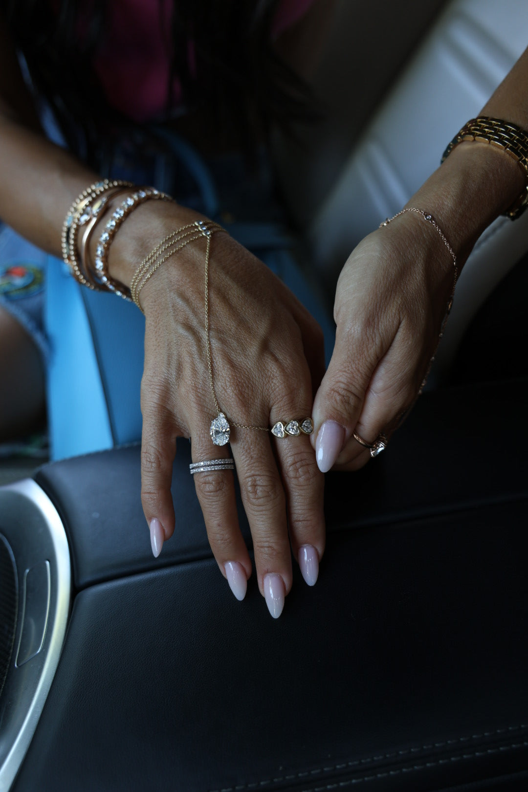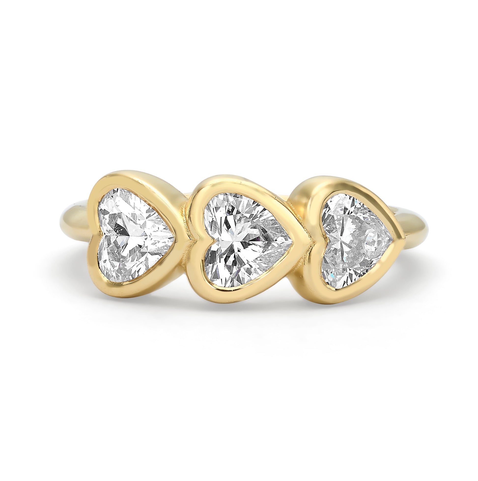 An eternal symbol of affection, this ring features three brilliant heart-shaped diamonds in a sleek 14k gold bezel setting. The design is both timeless and modern, perfect for celebrating a love that lasts forever.