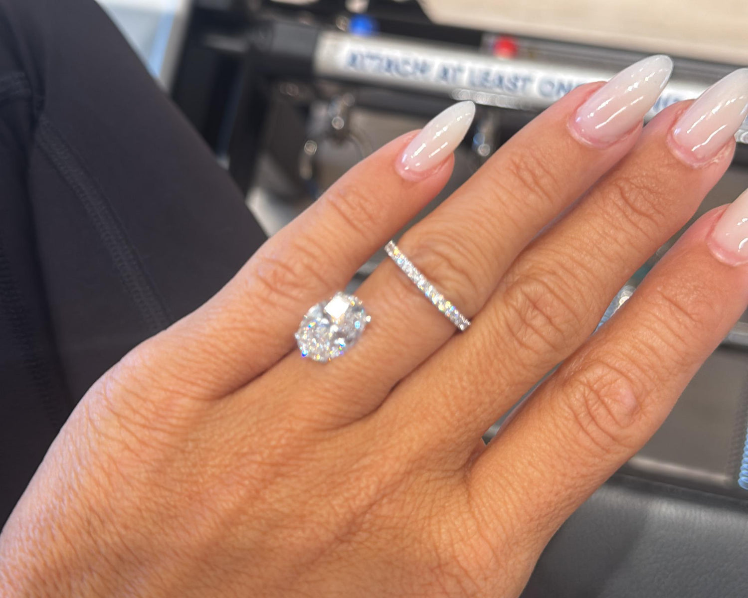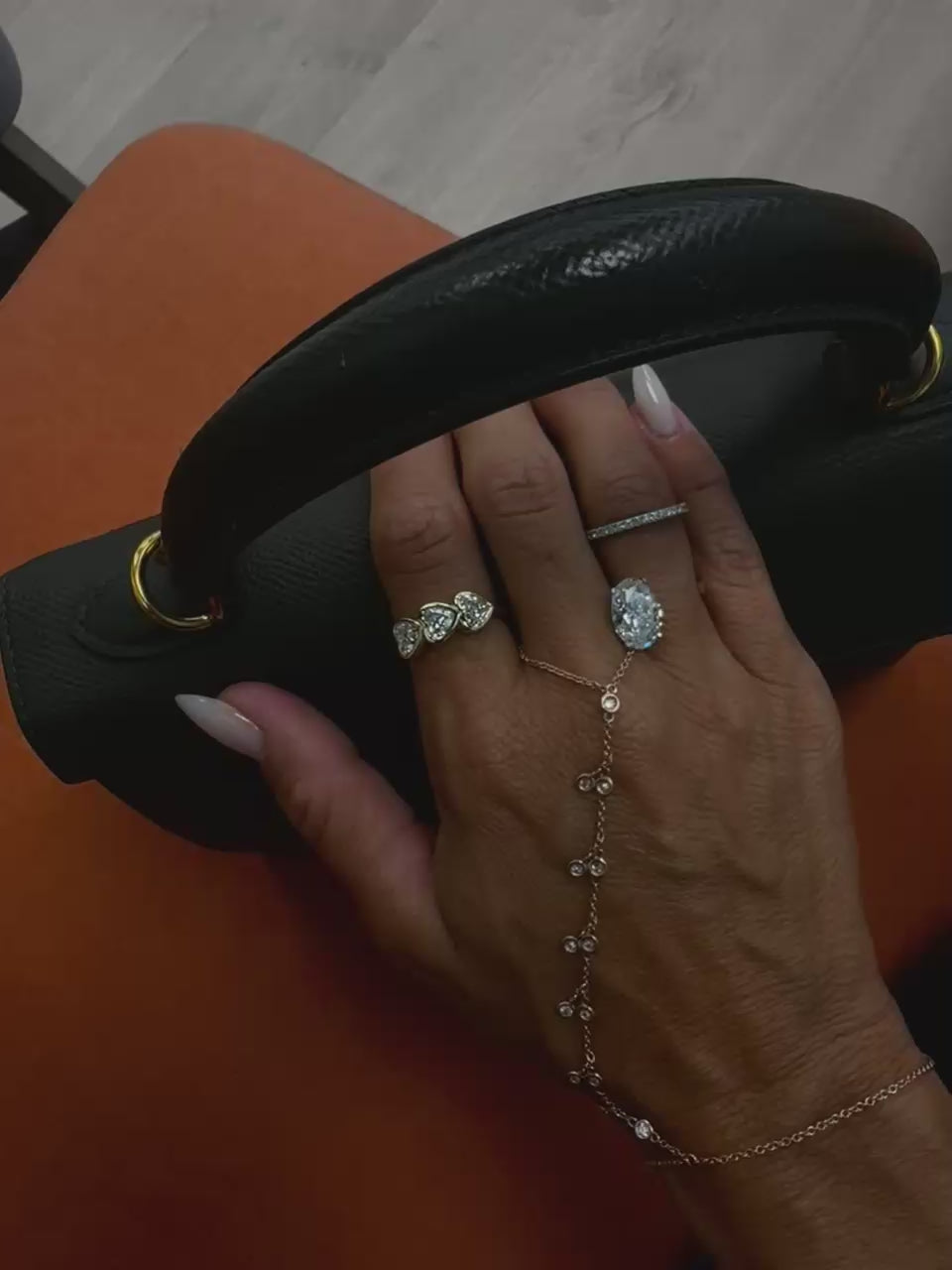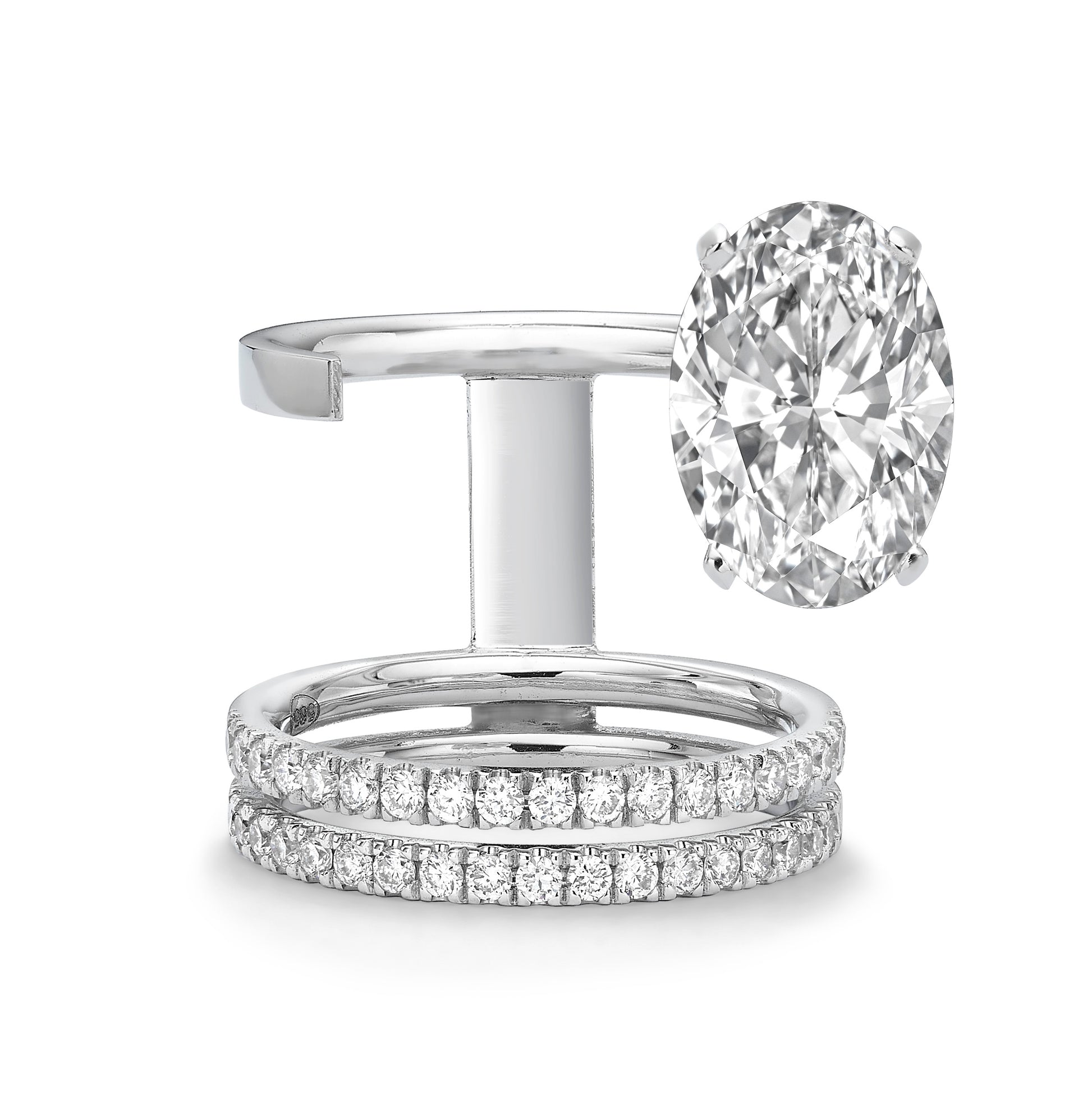 A bold silhouette featuring a floating oval-cut diamond and twin pavé bands — where structure meets sparkle.