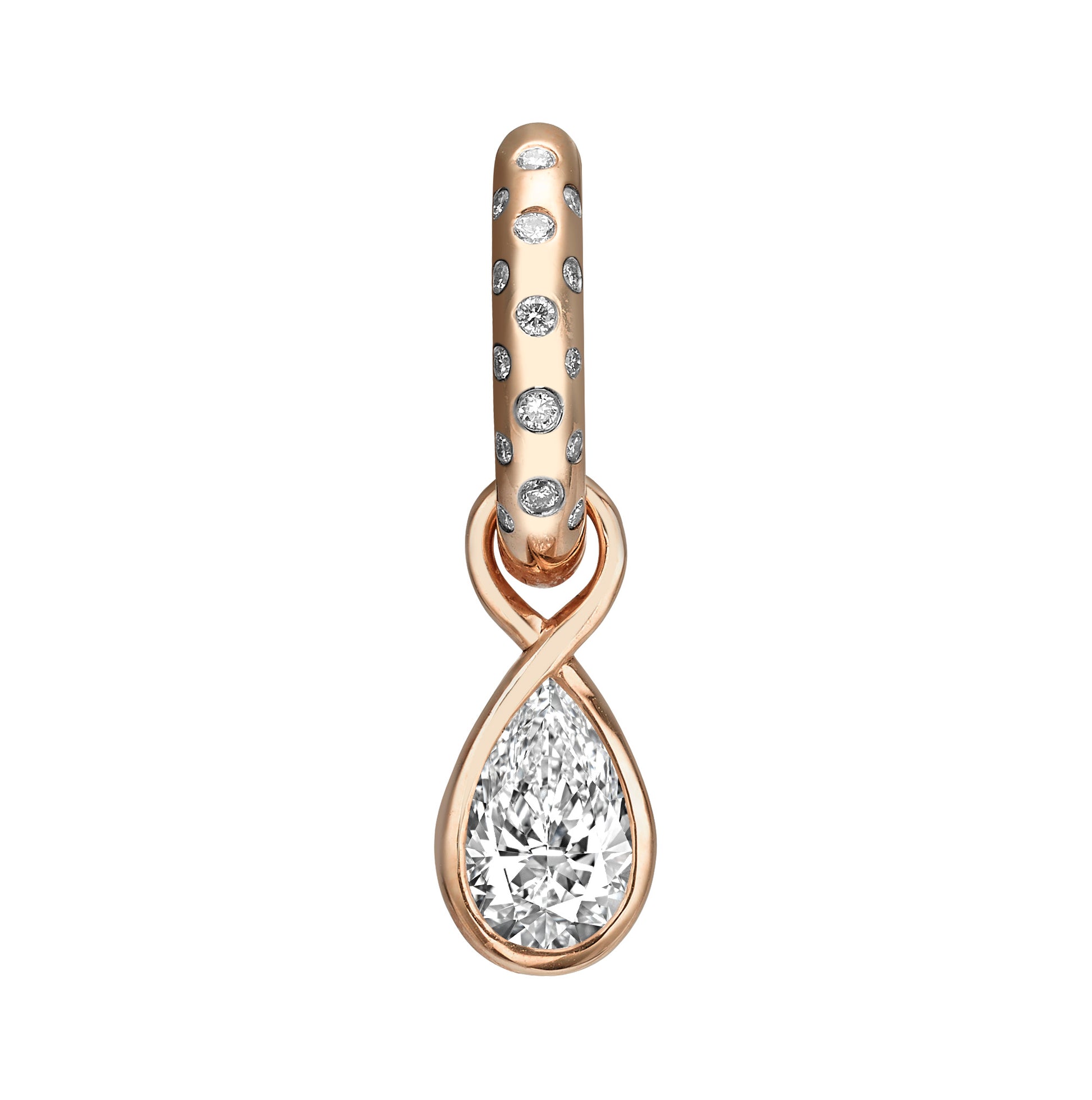A contemporary earring featuring modern design elements and refined craftsmanship, showcasing a pavé-set hoop adorned with flush-set round brilliant-cut lab diamonds. An elegant infinity-inspired bail connects to a bezel-set pear-shaped lab diamond drop, creating a sophisticated dangle silhouette. Crafted in rose gold, this piece combines secure settings with fluid, feminine curves. Perfect for the fashion-forward jewelry enthusiast who appreciates intricate detailing and statement-making drops. Sold individually.