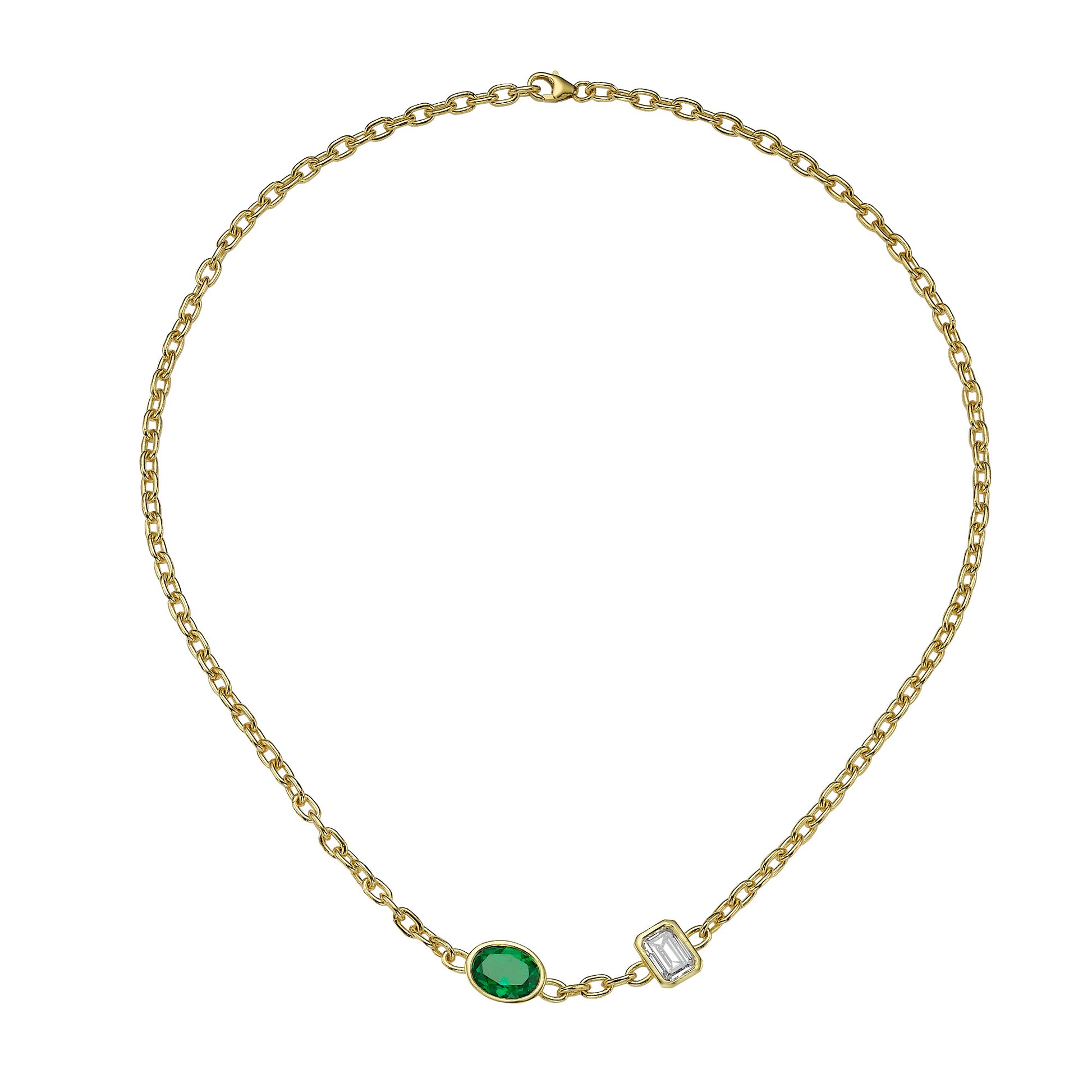 This refined gold chain necklace features a classic oval link design with two elegant gemstone accents positioned asymmetrically along the chain. An oval-cut emerald cabochon and an emerald-cut diamond are each bezel-set in gold, creating subtle yet sophisticated focal points. The warm rose gold chain complements the rich green of the emerald and the brilliant sparkle of the diamond, making this piece perfect for layering or wearing alone for understated luxury.
