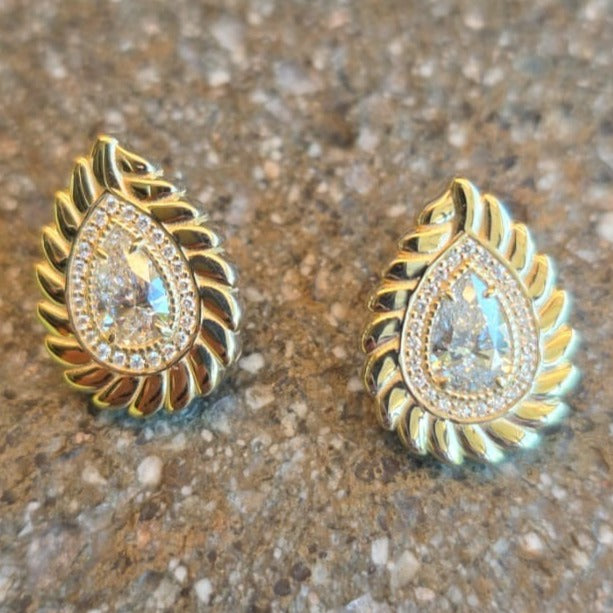 A piece of wearable art, these unique earrings feature a brilliant pear-cut diamond, encircled by a halo of pavé diamonds and a gracefully textured gold setting. It’s a bold design that combines modern art with timeless elegance.