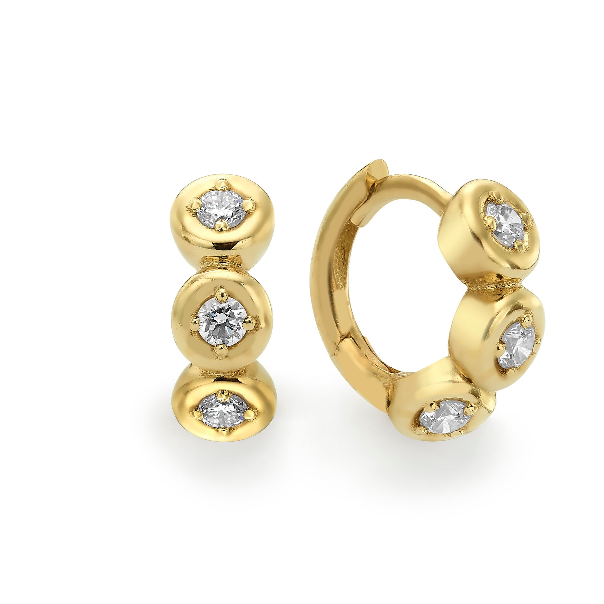 Effortlessly chic and incredibly versatile, these hinged hoop earrings feature three bezel-set diamonds stacked in a row. Their modern design and subtle sparkle make them a perfect choice for everyday elegance.