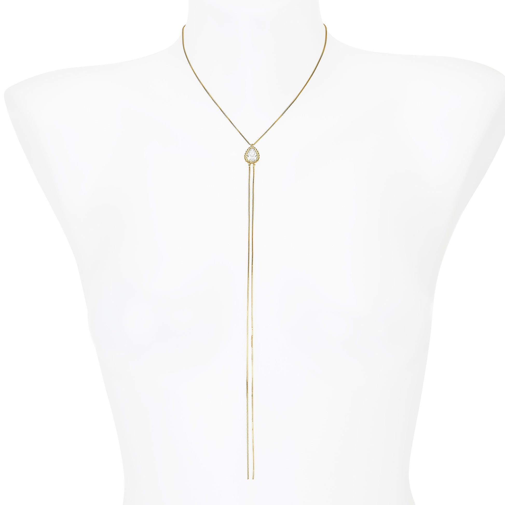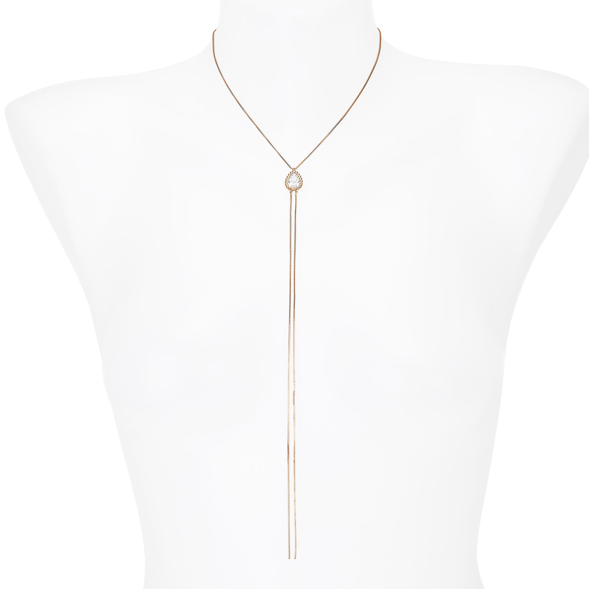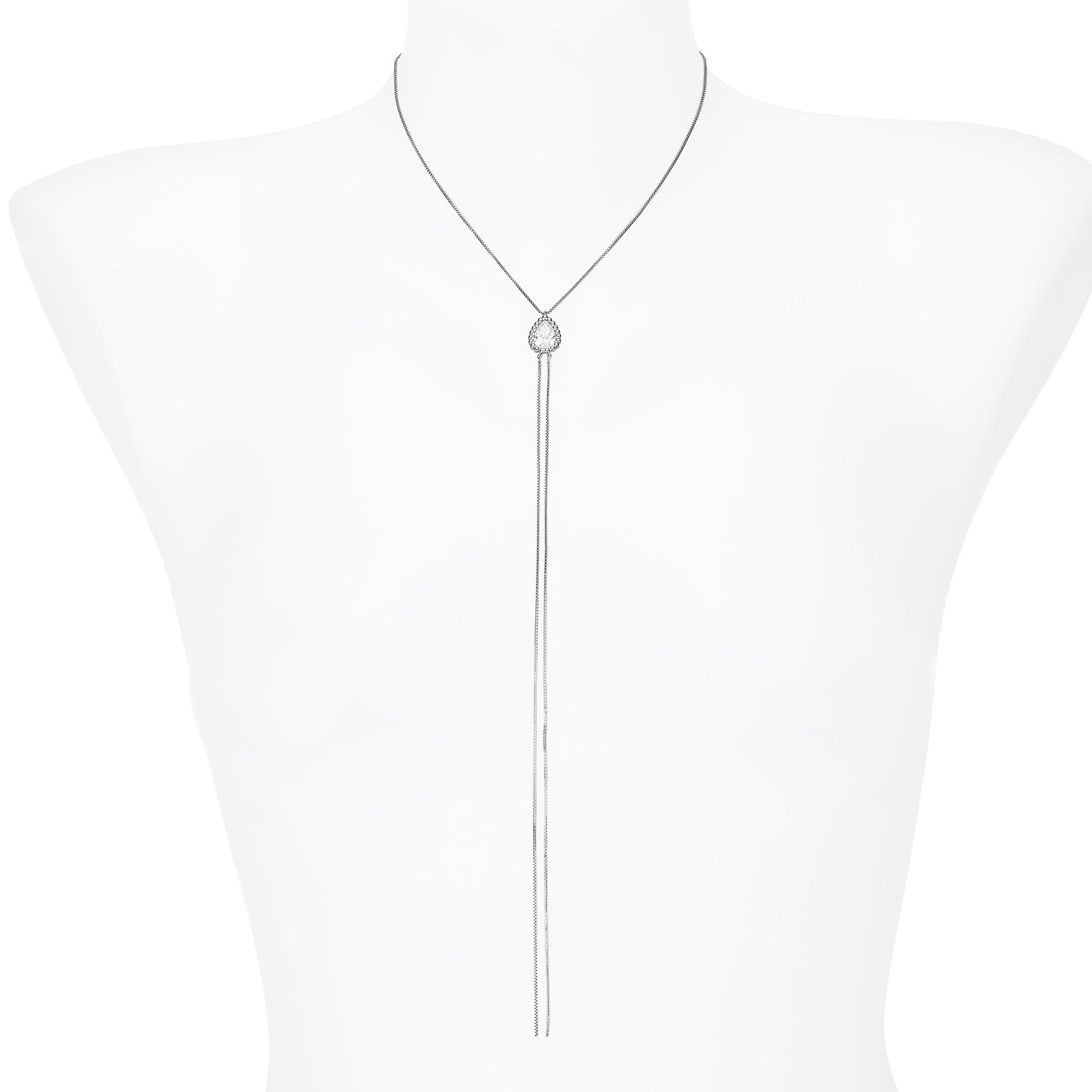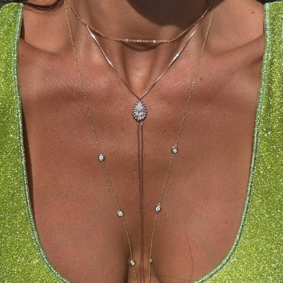An exquisite pear-shaped diamond, framed by a delicate halo, is the focal point of this elegant lariat necklace. The graceful, draping chains create a mesmerizing waterfall of light, perfect for a modern and sophisticated look.
