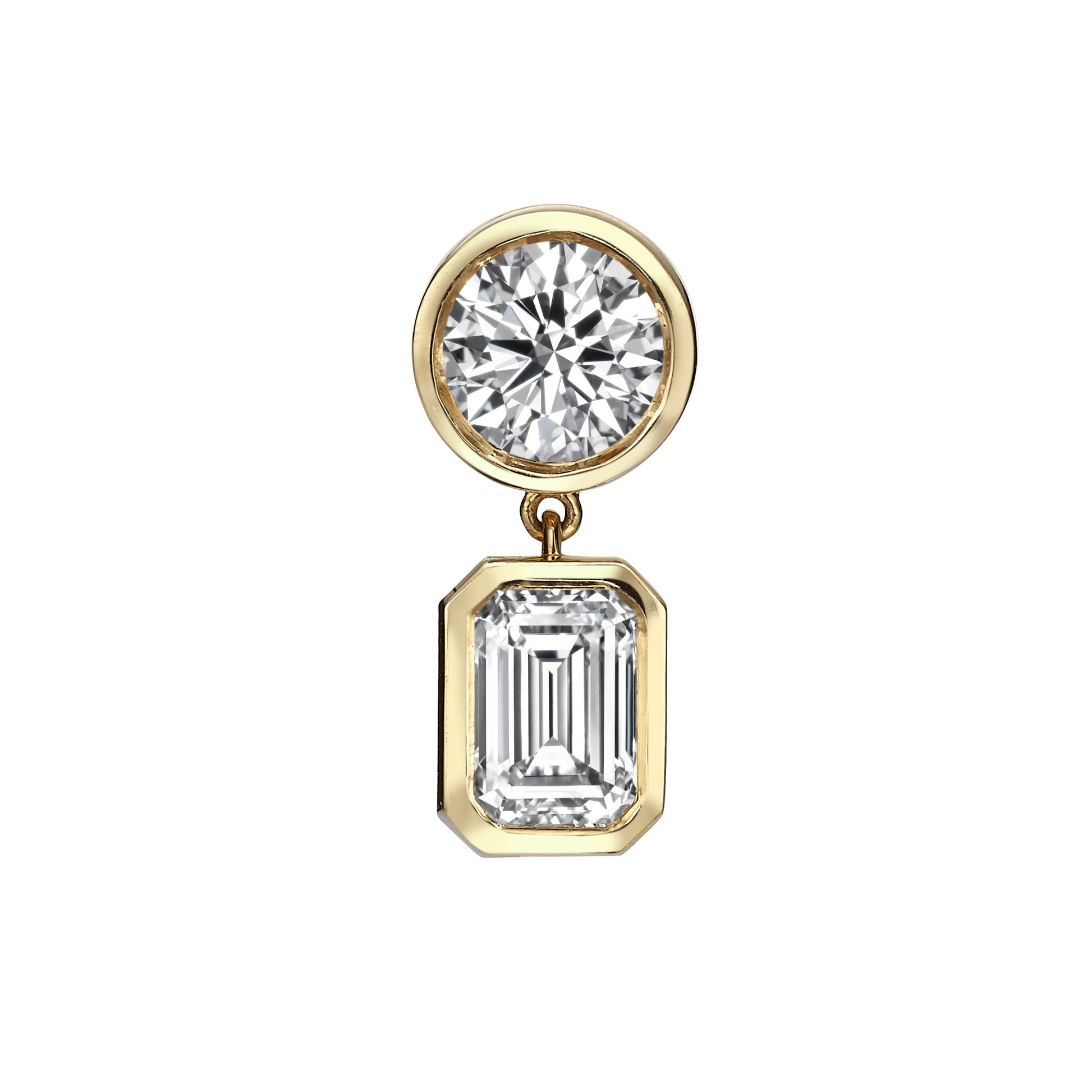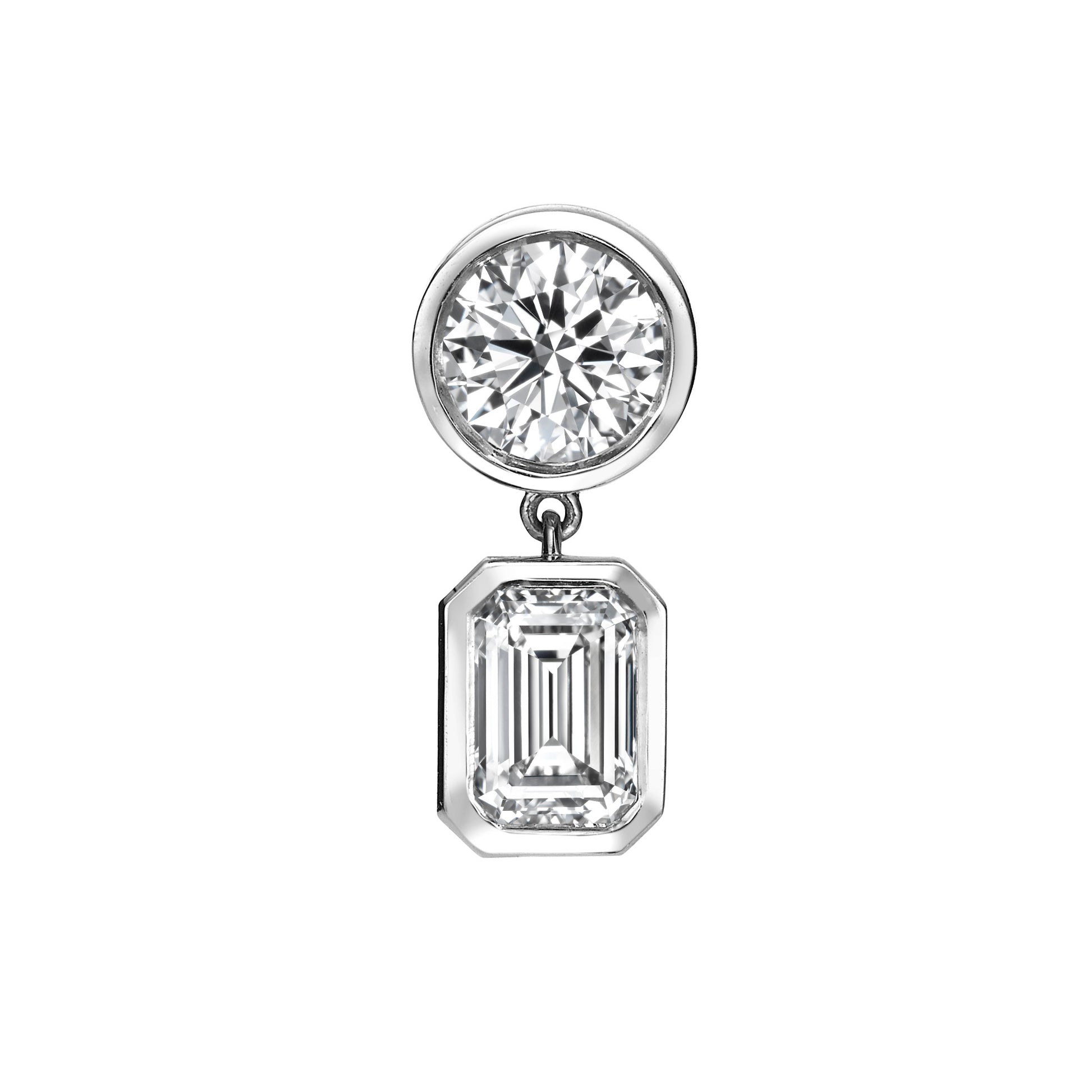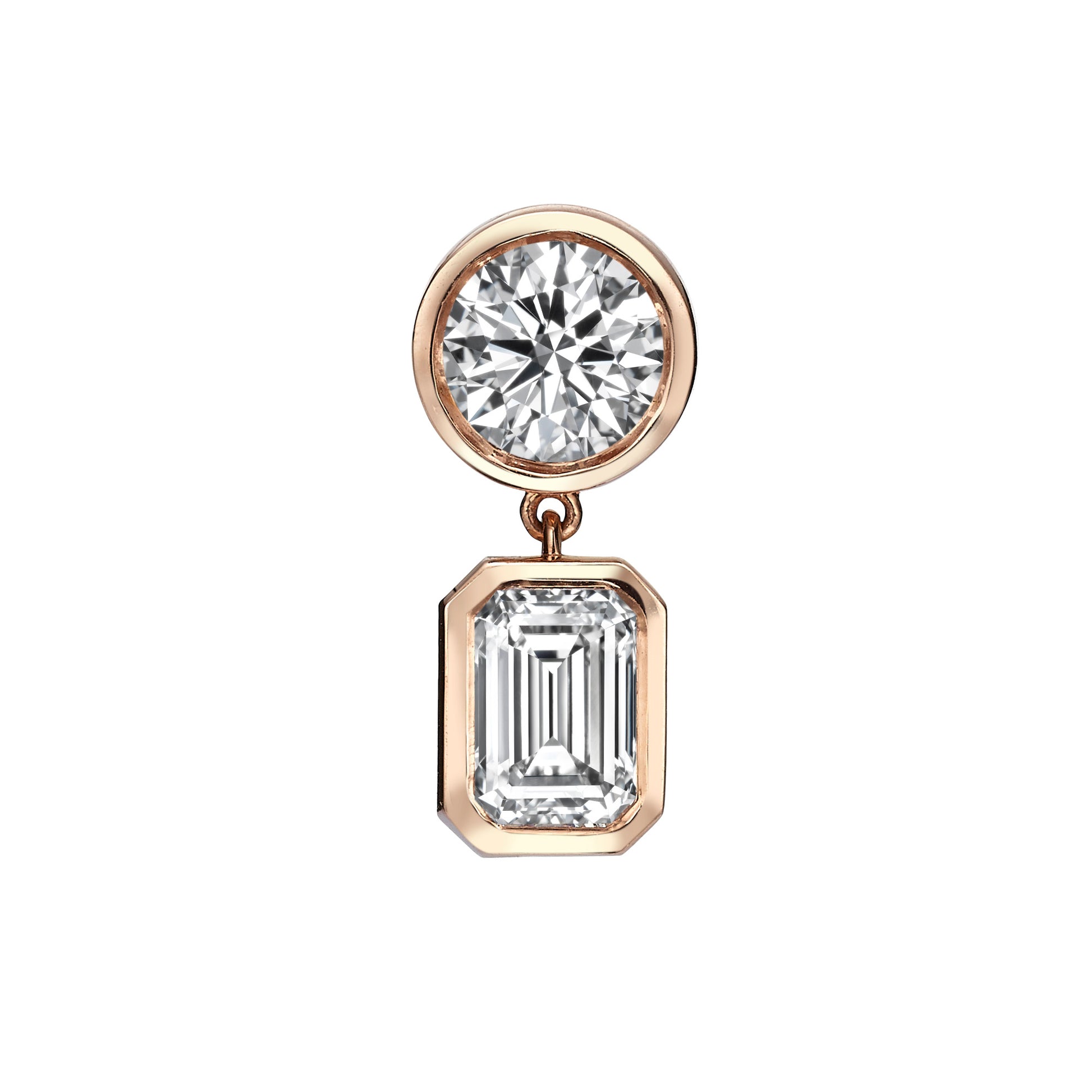 A contemporary earring featuring modern design elements and refined craftsmanship, showcasing a duo of lab diamonds: a round brilliant-cut in a protective bezel setting paired with an emerald-cut lab diamond drop in a bezel frame. The two stones cascade elegantly in rose gold. Perfect for the fashion-forward jewelry enthusiast who appreciates mixed-cut designs, clean lines, and secure bezel settings. Sold individually.